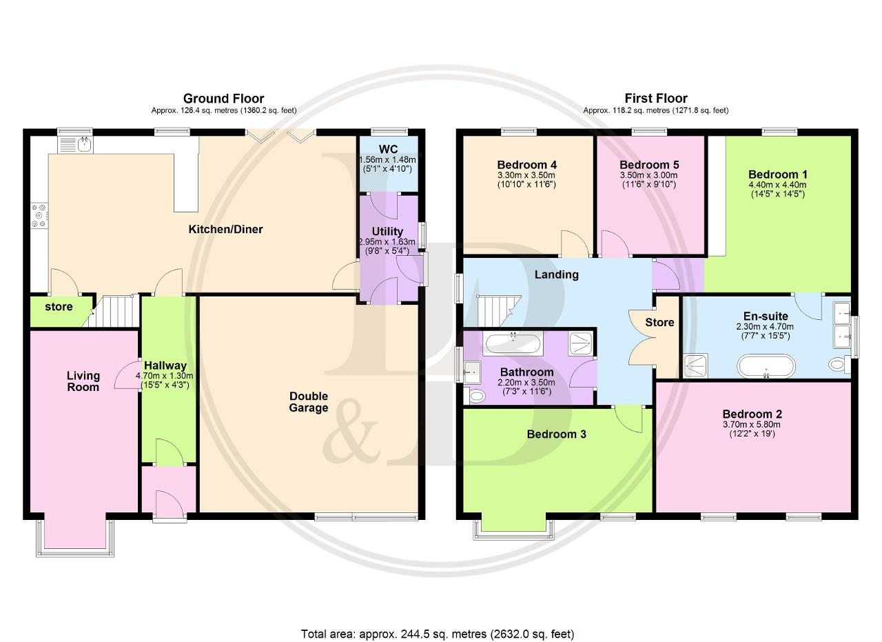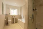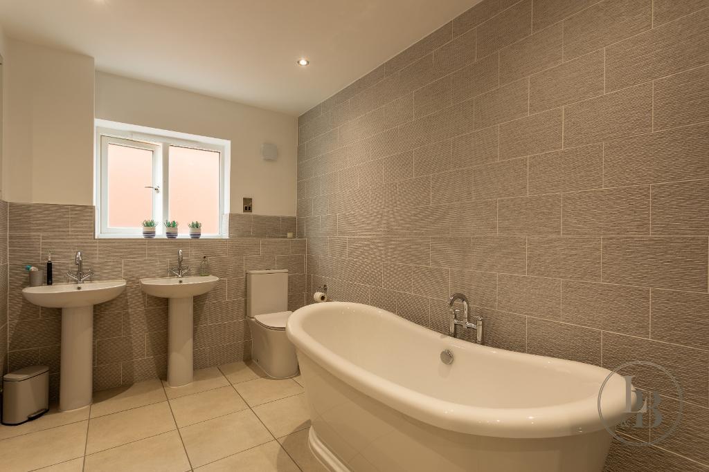 Upstairs, five well-proportioned bedrooms offer flexible living arrangements. The principal bedroom features fitted wardrobes and an en-suite bathroom with both a freestanding bath and separate shower. The second bedroom currently serves as a study or library, whilst the third bedroom, with its attractive bay window, functions as a home office. The remaining two bedrooms overlook the rear garden and both accommodate double beds comfortably.