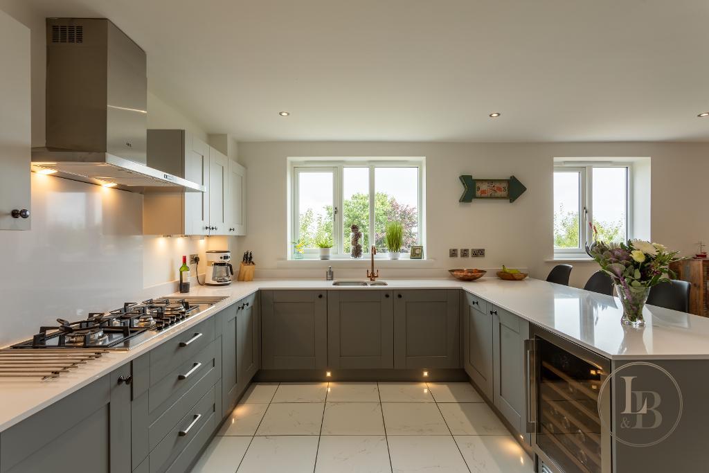 The ground floor centres around a well-appointed kitchen featuring Symphony units in a dual-tone finish, with integrated appliances throughout and a separate walk-in pantry providing excellent storage. The kitchen flows naturally into the dining area, making it ideal for both daily meals and entertaining guests. Beyond the kitchen a substantial utility room and downstairs WC / Cloakroom can be located.