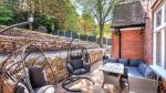 The elevated rear garden offers substantial lawn space suitable for therapeutic outdoor activities, while the Indian sandstone patio creates an ideal shared social space for multiple generations or residents to enjoy.